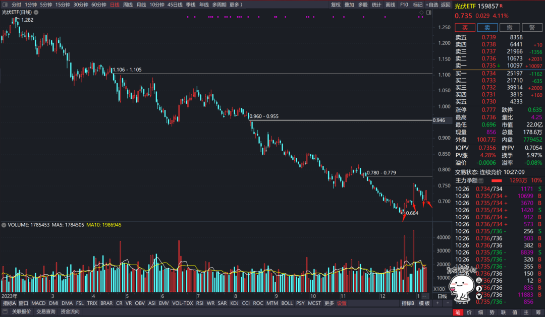以光伏ETF看,2022年8月到2023年12月,1.572跌至0.664,跌幅达57.8%。