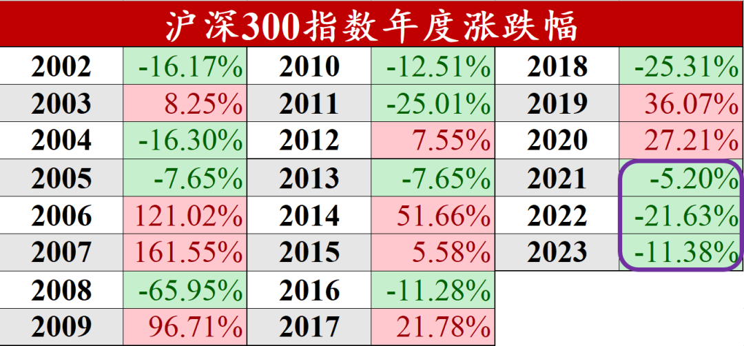 可以看到,算上2023年,沪深300已经连续下跌三年了。虽然听上去好像没什么,但这在沪深300诞生以来的二十多年里还从没有发生过。即使是2008年、2016年、2018年这些令人印象深刻的熊市年份,沪深300也仅下跌一年就转涨了。甚至可以说,眼下A股正在经历的,可能是二十年来持续时间最长的一轮熊市。