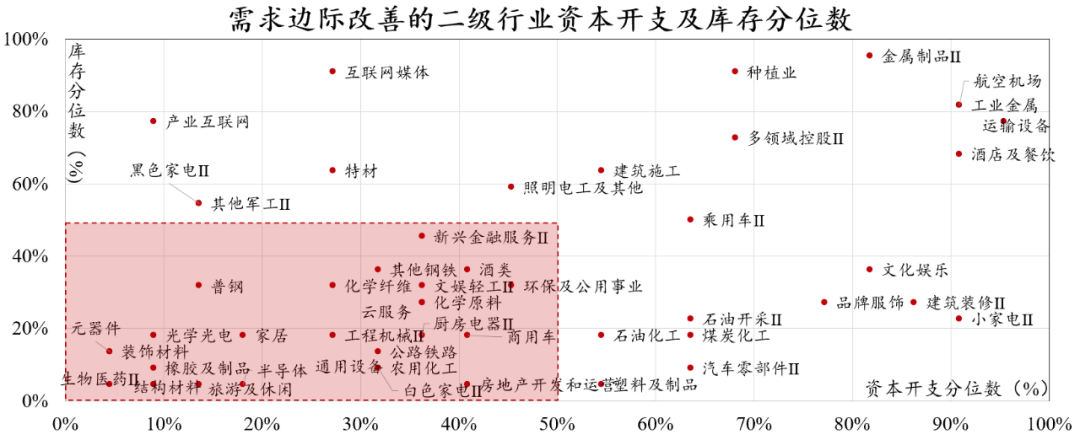如果把所有的细分行业拎出来,先筛选出整体趋势回暖的,再把它们在行业大周期里的位置标出来(库存、资本开支),就得到了下面这张图。