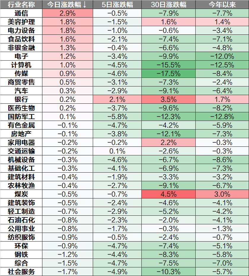 行业上来看,通信、美容护理、电力设备等板块领涨,社会服务、综合、钢铁等板块下跌。