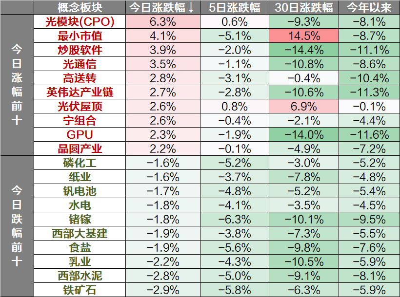 概念主题方面,光模块(CPO)、最小市值、炒股软件等板块上涨,铁矿石、西部水泥、乳业等板块下跌。