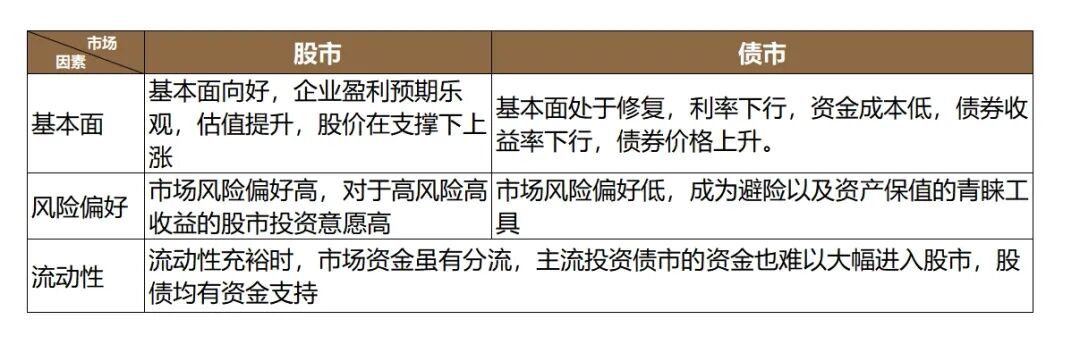 在政策利好的密集释放与市场情绪不断升温的双重驱动下,近期股票市场迎来了显著的回暖迹象。相比之下,自9月24日节前时段以来,债券市场却经历了一波回调风波。在此期间,不少债券基金和银行理财产品收益遭受了波动。这些变动让部分债基“收蛋人”感到焦虑和不安,权益行情趋于好转,股债跷跷板下,债市能否挺住? 经常投资的小伙伴都知道,股票和债券市场是金融市场中的两类极为重要的大类资产,在特定环境下,股票和债券两个市场呈现反向变动的现象,即“债涨股跌”、“股涨债跌”,也就是我们常说的股债跷跷板效应。 影响股、债走势的因素 为什么股债之间会呈现这种此消彼长的关系呢?影响股、债的走势关系的主要有三大因素:经济基本面、风险偏好和流动性。 当市场基本面向好,企业盈利预期修复,资本回报率会提升,股价在支撑下上涨的可能性更高。而对于债市而言,面对通胀与利率的上行,债券价格下跌压力大。反之,当基本面处于修复状态,利率处于下行通道,债券市场表现往往优于股票市场。 而从风险偏好角度来看,当市场整体风险提升时,投资者更愿意参与风险波动与收益预期更高的股票市场,而当市场风险偏好降低,投资者则会更为青睐确定性更高、波动更小的固收类资产,以实现自身资产的保值。 回顾历史上的股债表现,我们可以发现跷跷板股债“跷跷板”并非总是对立!某些时段市场会出现“股债双牛”或“双杀”局面,这一点则更多与市场流动性刺激相关。宽松的货币政策导向对于股和债均是利好,因此当市场流动性十分充裕如出现连续降准降息时,往往出现股债共同繁荣景象,而当流动性出现收紧时,股债则都会面临资金流出的压力。