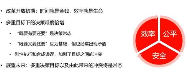 我们做企业、做投资都有体会,如果只有一个核心目标,决策会相对容易;把效率和公平放在一起,决策就已经很难了,因为两者虽然长期互为前提,但短期内经常矛盾冲突;再叠加了一个安全问题之后,决策就非常非常难。