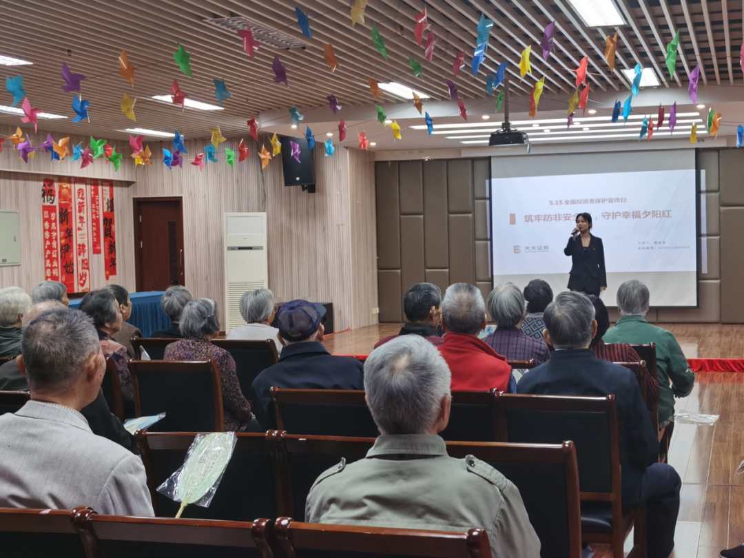 为进一步提高中老年人的金融防范意识,推进平安宁波建设,在“5.15全国投资者保护宣传日”来临之际,光大证券宁波北仑新碶营业部于2025年5月7日,走进北仑区中心福利院开展投资者教育与金融知识普及宣传活动,此次活动吸引了近100名老年人参与。 活动现场,为进一步优化宣传成效、强化金融知识普及的渗透力与感染力,营业部精心制作了一批独具特色的投教漆扇。这些漆扇以传统工艺为载体,巧妙融入金融安全宣传元素,扇面上醒目地印制着“打击股价操纵,保护投资者权益”、“警惕虚假平台,守护财产安全”、“养老钱袋要捂紧,诈骗陷阱莫跳进”等宣传标语。这既是对非法金融活动的严厉警示,也是对投资者特别是中老年群体合法权益的坚定守护。 活动开始,为有效调动中老年人的参与积极性,营业部工作人员谢金焓先运用简洁明了的文字表述及生动形象的图文展示带大家了解了“金融行业的分类”及“金融机构的作用”。 随后,围绕“防非反诈”及“反洗钱”两大专题展开,选取了“非法荐股”、“保健品陷阱”、“扶贫款成洗钱工具”等具有代表性的典型金融案例进行深度剖析。为进一步强化宣讲效果,促进知识吸收,谢金焓在案例讲解过程中设置了互动问答环节。大家积极参与,纷纷踊跃举手发言,现场气氛热烈活跃。 此次活动,不仅有效提升了中老年群体的金融风险防范意识,更为他们在实际生活中切实保护自身财产安全提供了有力的知识支撑与行动指引。未来,我们将继续加强与社区的合作,定期开展类似的投资者教育活动,为构建平安金融贡献更多力量。