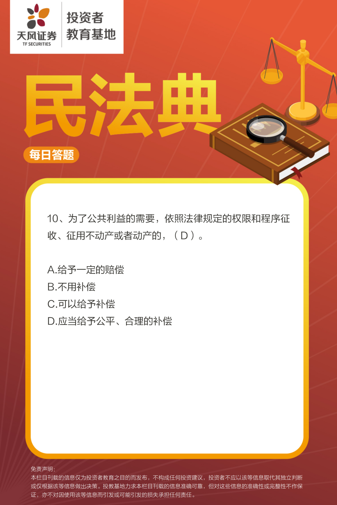 为全面贯彻落实党的二十大和二十届二中全会精神,深入学习宣传贯彻习近平法治思想,引导投资者深入学习民法典,重点宣传平等、自愿、公平、诚信等基本原则,促进经济高质量发展营造良好法治环境,天风证券投教基地特别开展民法典每日答题互动活动,欢迎广大投资者参与。点击图片,查看答案↓