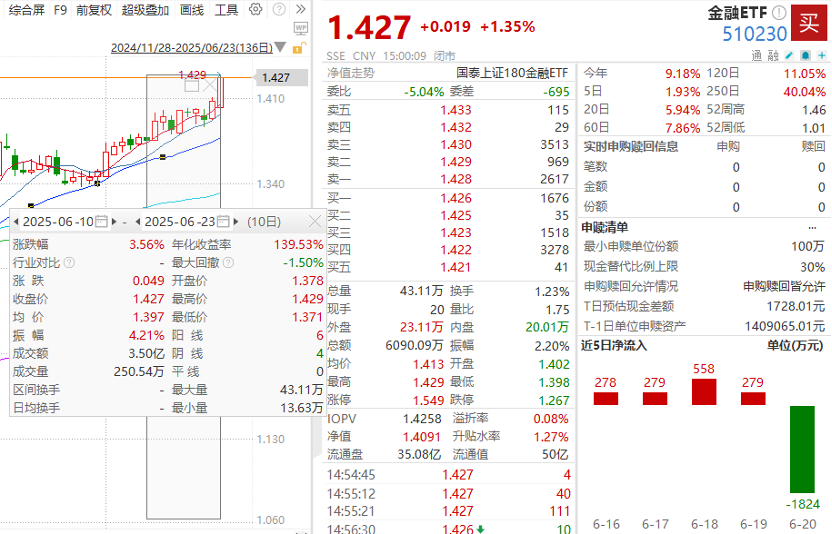 6月23日,金融ETF(510230)上涨1.35%位居市场前列,近5日上涨1.93%,近10日上涨3.56%,核心推动力在于银行板块。