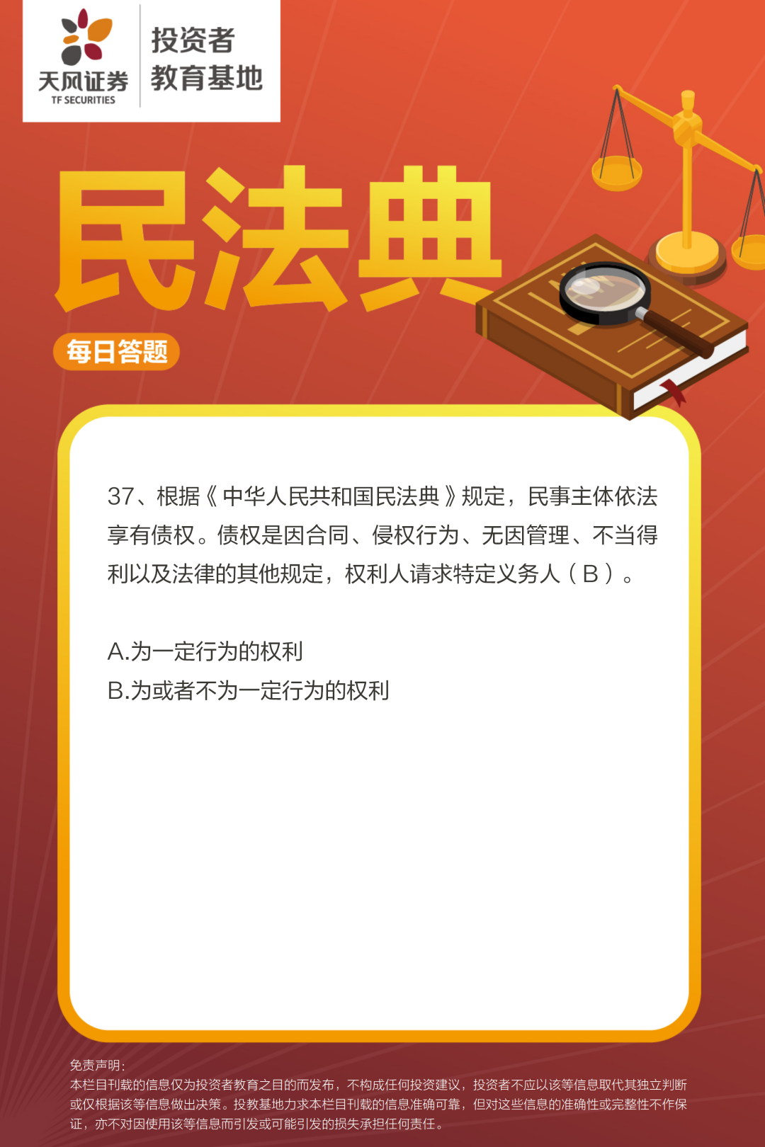 为全面贯彻落实党的二十大和二十届二中全会精神,深入学习宣传贯彻习近平法治思想,引导投资者深入学习民法典,重点宣传平等、自愿、公平、诚信等基本原则,促进经济高质量发展营造良好法治环境,天风证券投教基地特别开展民法典每日答题互动活动,欢迎广大投资者参与。点击图片,查看答案↓点击图片,查看答案↓点击图片,查看答案↓