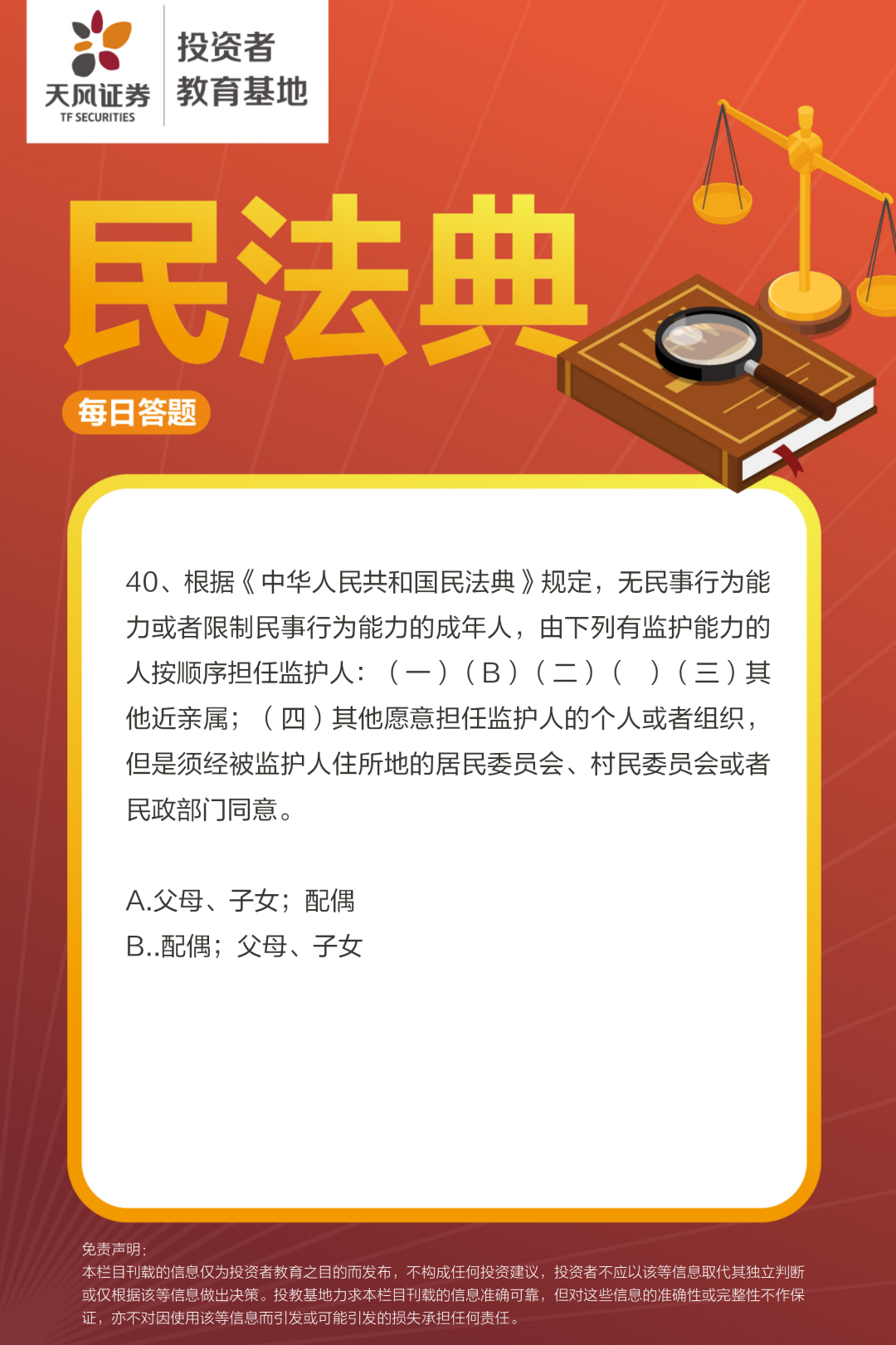 为全面贯彻落实党的二十大和二十届二中全会精神,深入学习宣传贯彻习近平法治思想,引导投资者深入学习民法典,重点宣传平等、自愿、公平、诚信等基本原则,促进经济高质量发展营造良好法治环境,天风证券投教基地特别开展民法典每日答题互动活动,欢迎广大投资者参与。点击图片,查看答案↓点击图片,查看答案↓点击图片,查看答案↓点击图片,查看答案↓