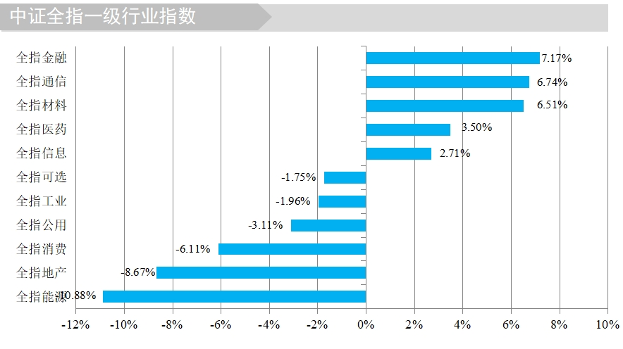 中证系列行业指数中,全指金融、全指通信指数累计上涨7.17%、6.74%,涨幅最大。