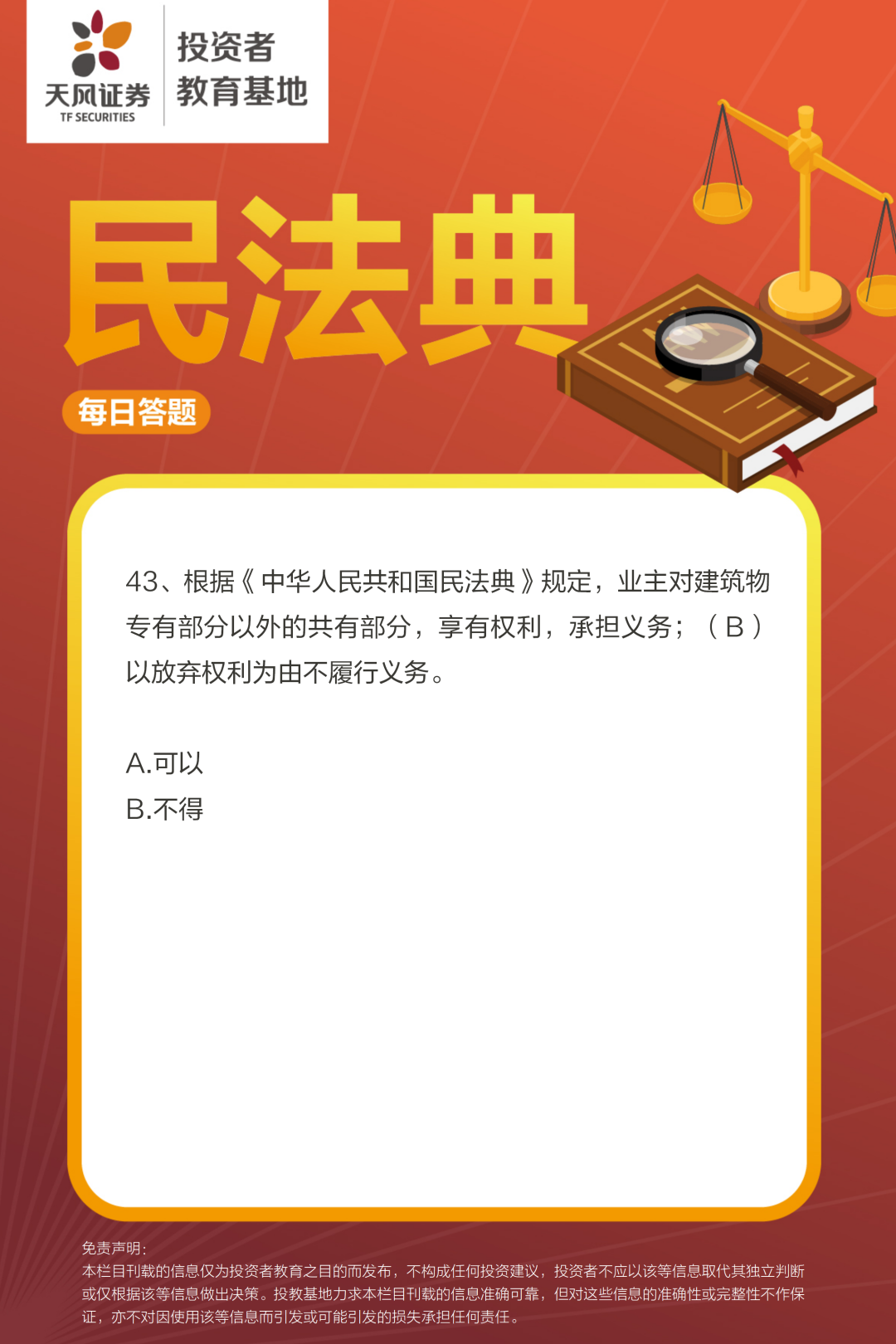 为全面贯彻落实党的二十大和二十届二中全会精神,深入学习宣传贯彻习近平法治思想,引导投资者深入学习民法典,重点宣传平等、自愿、公平、诚信等基本原则,促进经济高质量发展营造良好法治环境,天风证券投教基地特别开展民法典每日答题互动活动,欢迎广大投资者参与。点击图片,查看答案↓点击图片,查看答案↓点击图片,查看答案↓点击图片,查看答案↓