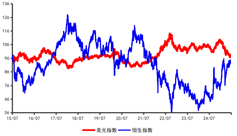 从历史数据看,恒生指数与美元指数波动负相关性较强。当前海外正处于弱美元周期,Wind数据显示,7月1日美元指数盘中最低至96.37,创2022年2月下旬以来新低。在此环境下,持有美元计价资产风险上升,或导致投资者另寻价值洼地,港股市场则有望成为“受益者”。