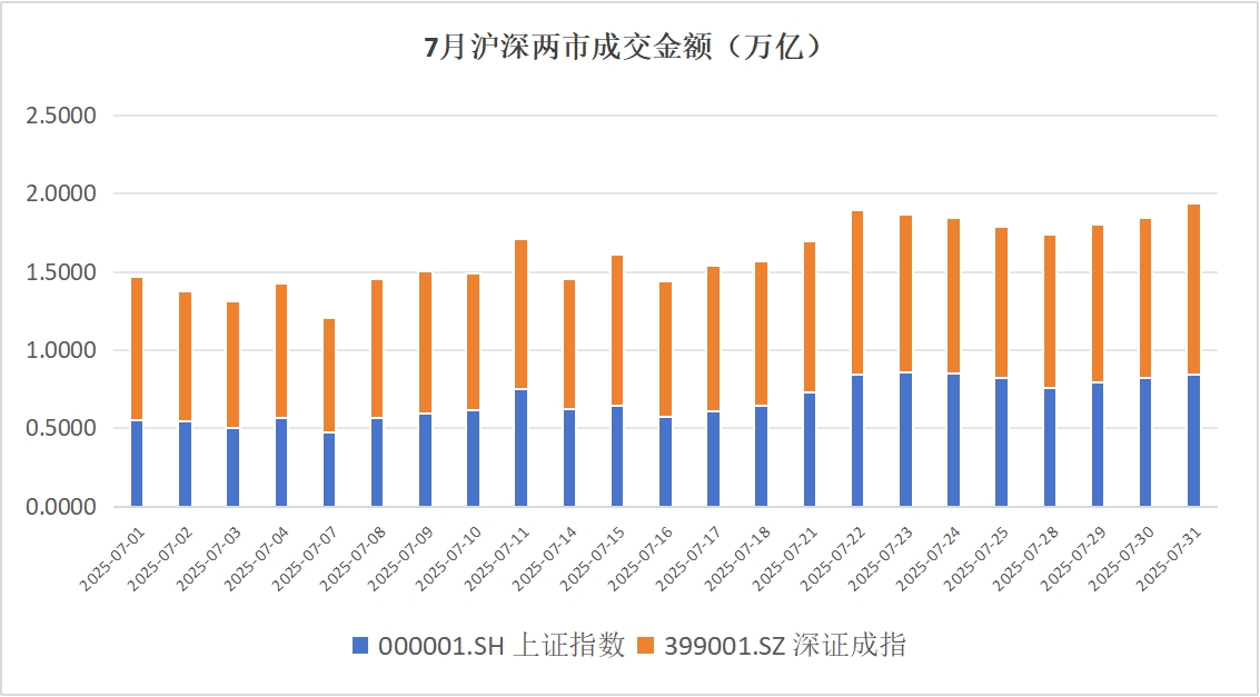 在上半年末指数走出经典“红三兵”组合后,7月以来上证指数势如破竹,连续突破3500点、3600点两大整数关口,交投情绪持续躁动,沪深两市成交额稳定超万亿,其中七月下旬连续11个交易日成交额突破1.5万亿。