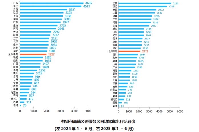 1)2024年上半年数据显示,进入我国高速公路服务区的日均驾车活跃度主要集中于2000以内(加权平均数为1937),占比超过全国服务区的6成,其中又以低于1000为主,占比44.89%,而日均活跃数高于3000以上的服务区占比累计为21.96%。从省份看,高于和低于1937这一平均水平的省份均为 16 个,其中高于3000 的6个省份分别为江苏、浙江、安徽、江西、上海、湖南,主要集中于长三角地区和邻近省份。与2023年同期相比,各省份位次比较稳定。这说明,中国高速服务区的出行活跃度可能存在较大的差异,按《报告》的计算方法,省份之间可能有几倍甚至十几倍的差距(注:《报告》中的数据均经过变形出来,差距不代表真实数据,仅代表相对数量)。