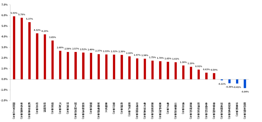 上周上证综指涨2.11%,深证成指涨1.25%,创业板指涨0.49%,科创50涨0.65%。上周申万31个行业中27个行业收涨。涨幅居前行业有国防军工、有色、机械设备等;涨幅靠后行业有医药生物、计算机、商贸零售等。
