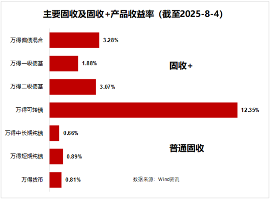 截至8月4日,主要的固收+产品收益率都跑赢普通固收产品。普通或者说传统固收产品年初以来的收益率都不到1%,中长期纯债最低,只有0.66%。