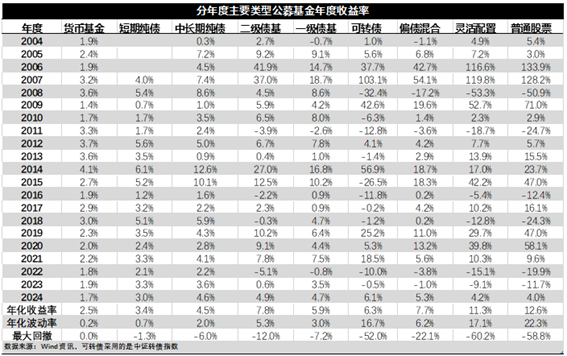 我们做了一张表,列出了9类公募基金产品的历史收益率,时间长度从2004年至今,总计有21个完整年度。