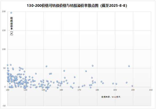 价格130以上的转债,从理论上来说,除了那些还没进入转股期的新上市转债,随时都有可能进入强赎,转股溢价率应该降为零。但我们看截至上周五的数据(8月8日),130-200区间的转债,转股溢价率大部分都在0-50%这个区间,中位数大约是15%。这意味着这些转债一旦宣布强赎,持有人将立即亏掉这个转股溢价率。我理解有些机构确实有配置高价格转债的需求,但对于一个需要尽量避免错误的投资人来说,价格超过130并且还有超过10%的转股溢价率,这其中显然博弈的难度很大。