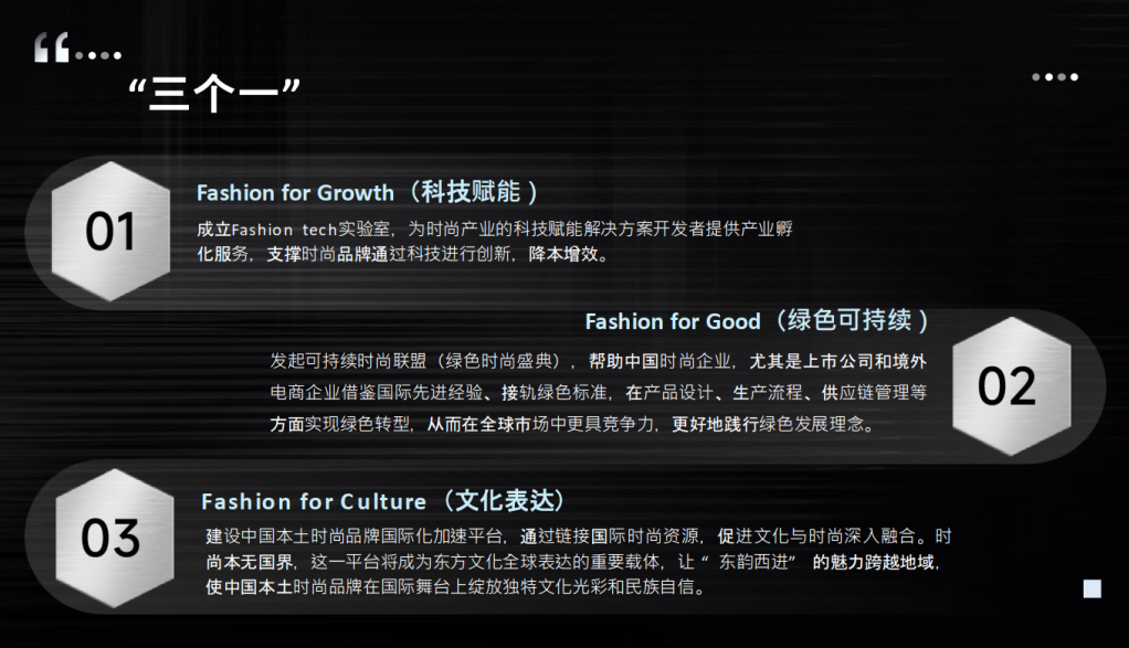 我们将三个趋势总结为:Fashion for Growth(科技赋能)、Fashion for Good(时尚向善)、Fashion for Culture(文化表达)。
