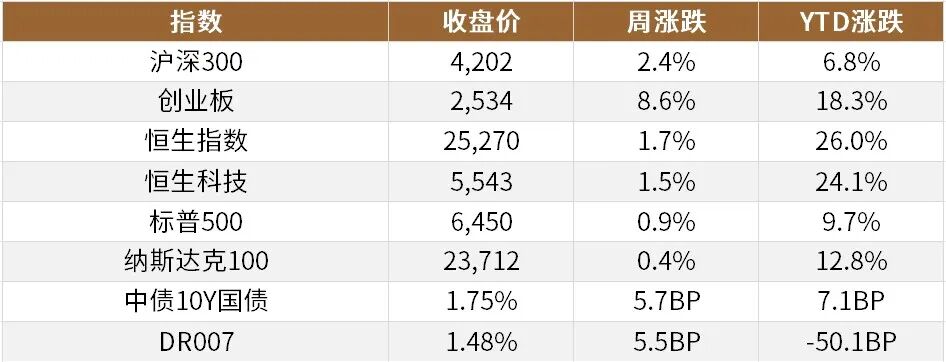 六、股票投资策略 1 股票市场周度回顾 A股市场整体表现:本周继续创新高,成长优于价值。上证综指1.70%,沪深300指数为2.37%,深证成指为4.55%,创业板指为8.58%,中证1000为4.09%,国证2000为3.86%。 行业表现:行业涨跌互现,科技非银领涨,通信7.66%,电子7.02%,非银金融6.48%,电力设备5.84%和计算机5.38%;银行和周期调整较多,银行-3.19%,钢铁-2.04%,纺织服饰-1.37%,煤炭-0.87%,公用事业-0.55%。 港股市场整体表现:港股亦明显走强,恒生指数为1.65%、恒生科技为1.52%。 行业表现:行业普遍走强,医疗保健业7.27%领涨,其次为原材料业5.50%,资讯科技业4.44%;仅公用事业-0.59%出现调整。 2 投研随笔 上证指数一举突破3700,超过去年10月8日高点;核心原因仍是我们上周所说的,资产荒背景下的超强流动性,大量资金涌入权益,尤其是活跃资金通过理财搬家或者融资的形式进入权益市场,因此短期的热度非常高涨,成交额持续突破2万亿。从长期趋势上看,流动性流入的逻辑将持续存在;一方面无风险利率下行,以及之前发行的高收益债陆续到期,因此需要寻求新的高收益标的,并能够实现长久期目的;而OCI账户买入红利是相对稳健的高收益方式,尤其是目前中证红利仍有将近4%的股息,因而险资等长期资金具有较强的加仓动力。另一方面,居民端因为资产荒的原因,可投资产基本上只剩下权益方向,因此只要股权风险溢价仍具有配置价值,权益仍是不错的选择。而这个改变的力量核心需要看到PPI的转正,经济具有更强的上行动力,因此中期来看,牛市不言顶。但存在一个问题,短期由于资金的大幅涌入导致长期收益差被瞬间抹平,而长期资金则会放缓流入;即我们常说的高拥挤度。今年以来最典型的例子就是2月恒生科技受海外降息预期催化迎来大涨,随后阿里巴巴的资本开支预期点燃了对于恒生科技的热情,南下资金大幅涌入创下近期新高;但由于资金情绪的降温,也迎来了大幅调整。因此近期也需要关注情绪的降温,对于市场的冲击;但中长期逻辑下,我们坚持调整就是买入机会。 港股近期表现并不如A股强势,主要由于A股中的相关炒作标的,包括军工、新能源、机器人等方向,港股中相对较少。但另一方面,AH溢价指数则创出近几年来新低,核心原因在于险资等持续偏好港股红利,对于AH溢价的波动贡献较大。而从近期资金表现来看,南下资金大幅流入,表明国内资金对于港股的偏好,另一方面亦因为短期A股明显强于港股的情况下,认为港股存在补涨的可能性。此外,美国降息预期大幅提升,流动性充裕亦利好港股。