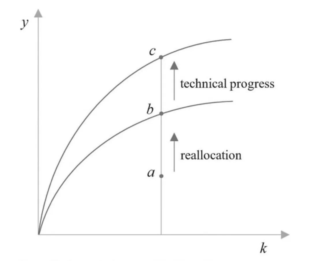 以上图为例,改革开放后,中国通过优化资源配置,把经济从较低效率的a点,推高到了b点。