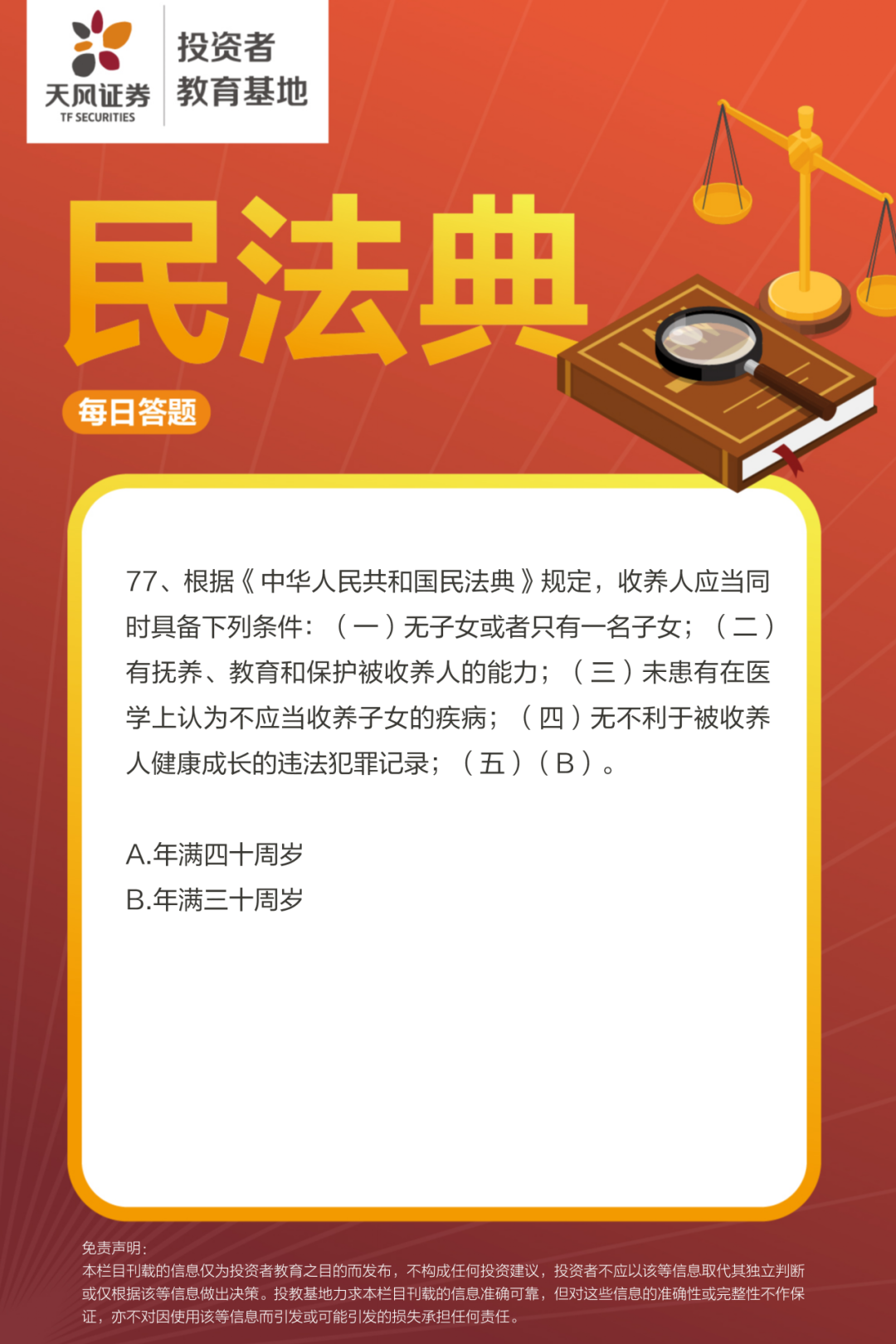 为全面贯彻落实党的二十大和二十届二中全会精神,深入学习宣传贯彻习近平法治思想,引导投资者深入学习民法典,重点宣传平等、自愿、公平、诚信等基本原则,促进经济高质量发展营造良好法治环境,天风证券投教基地特别开展民法典每日答题互动活动,欢迎广大投资者参与。点击图片,查看答案↓点击图片,查看答案↓点击图片,查看答案↓点击图片,查看答案