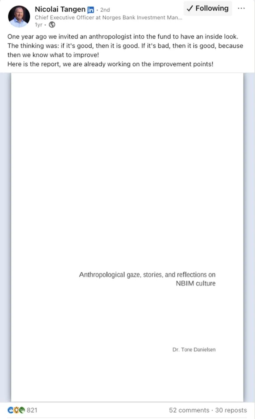 在尼科莱·坦根(Nicolai Tangen)看来,健康的企业文化,是让人敢“打直球”的文化。他用这个“冰球”不断强化这种企业文化,就像一个“鼓励”和“提醒”——每个人都要敢于抛出最直接的质疑,而不用过度担心冒犯他人。