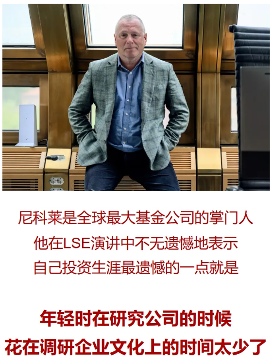 在回顾自己的投资生涯时,尼科莱坦言最遗憾的一点,就是年轻时在研究公司的时候,花在调研对方企业文化上的时间太少了。他甚至专门gap了两年,去伦敦政治经济学院攻读社会心理学硕士,这个学位成了他最看重的一笔财富,因为里面的原理,他至今每天都在实践。