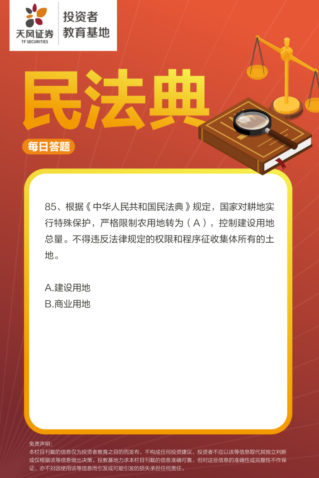 为全面贯彻落实党的二十大和二十届二中全会精神,深入学习宣传贯彻习近平法治思想,引导投资者深入学习民法典,重点宣传平等、自愿、公平、诚信等基本原则,促进经济高质量发展营造良好法治环境,天风证券投教基地特别开展民法典每日答题互动活动,欢迎广大投资者参与。