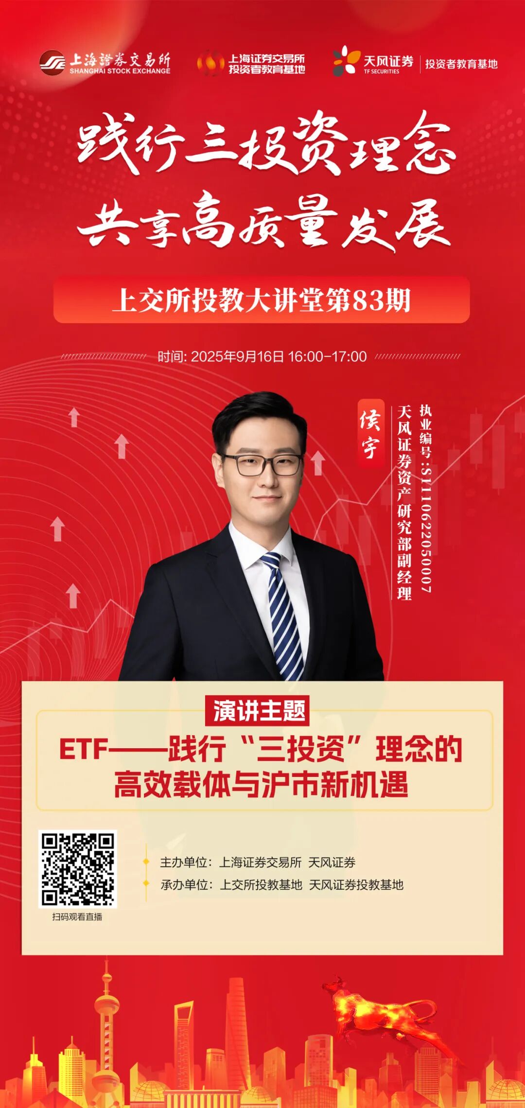 为更好地保护好投资者尤其是中小投资者的合法权益,引导广大投资者践行理性投资、价值投资、长期投资理念,天风证券携手上海证券交易所,为广大投资者带来“践行三投资理念,共享高质量发展”主题投教课程。