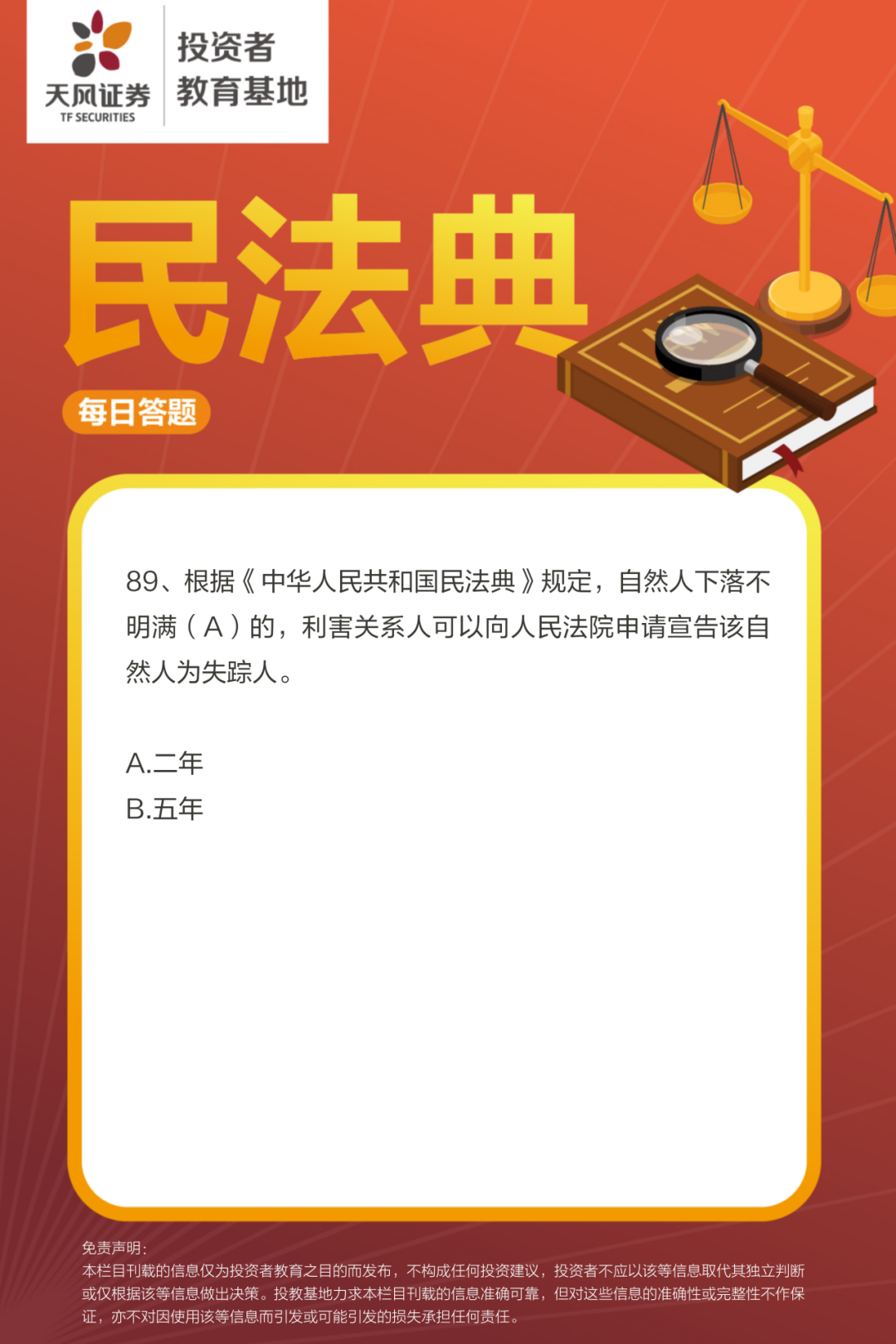 为全面贯彻落实党的二十大和二十届二中全会精神,深入学习宣传贯彻习近平法治思想,引导投资者深入学习民法典,重点宣传平等、自愿、公平、诚信等基本原则,促进经济高质量发展营造良好法治环境,天风证券投教基地特别开展民法典每日答题互动活动,欢迎广大投资者参与。点击图片,查看答案↓点击图片,查看答案↓点击图片,查看答案↓点击图片,查看答案