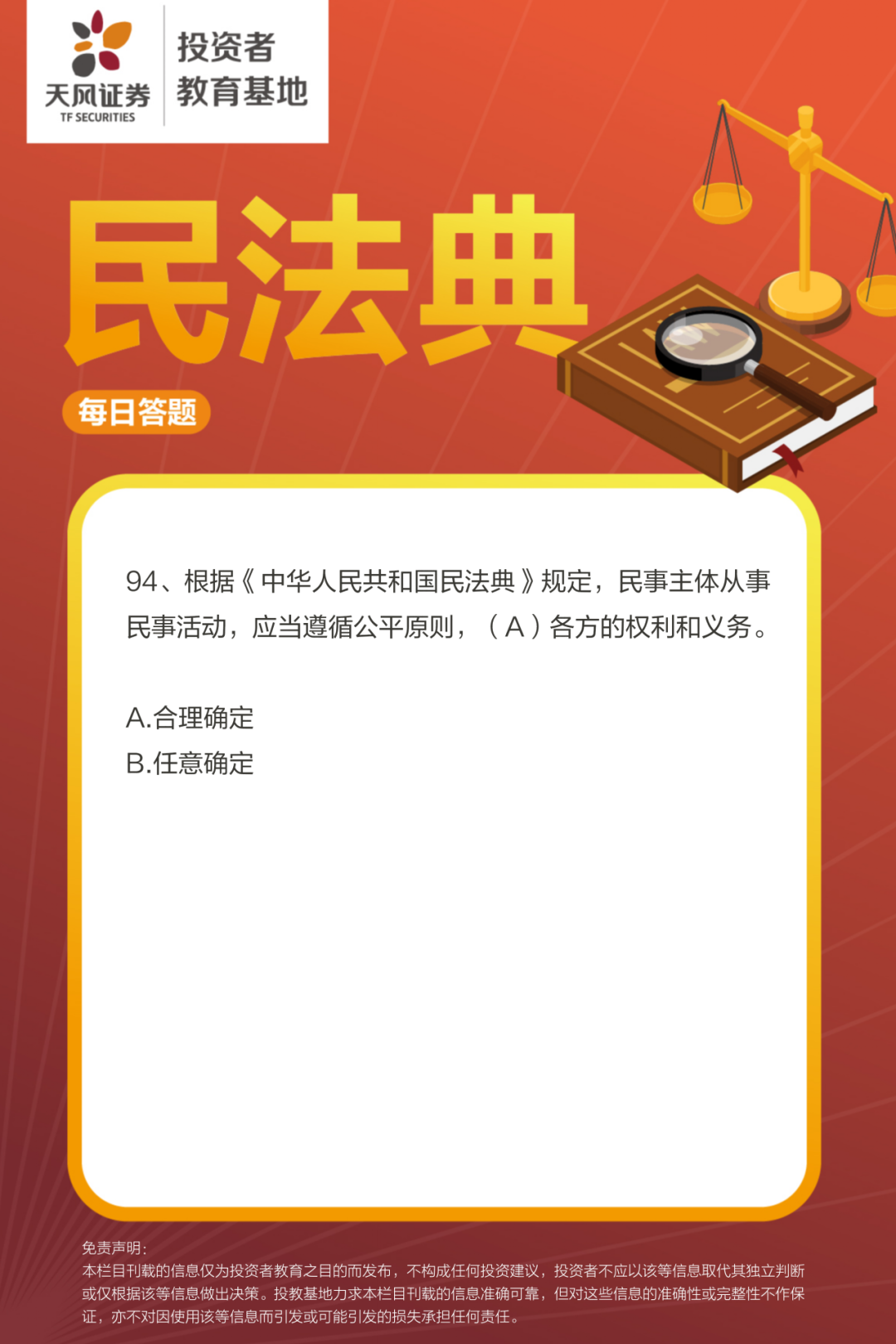 为全面贯彻落实党的二十大和二十届二中全会精神,深入学习宣传贯彻习近平法治思想,引导投资者深入学习民法典,重点宣传平等、自愿、公平、诚信等基本原则,促进经济高质量发展营造良好法治环境,天风证券投教基地特别开展民法典每日答题互动活动,欢迎广大投资者参与。点击图片,查看答案↓点击图片,查看答案↓点击图片,查看答案↓点击图片,查看答案
