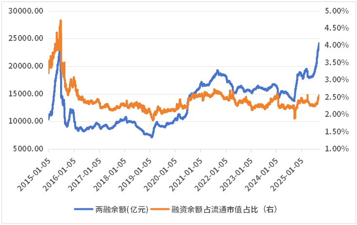 就这轮行情来看,流动性是核心驱动力,这主要源于市场风险偏好的提升。而在A股市场,两融余额具有很强的杠杆属性,可较好地反映市场风险偏好的变化,如果我们用两融余额占A股流通市值的比例来刻画两融绝对值的变化可发现,相较于2015年,本轮行情没有那么“激进”。