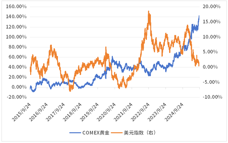 一方面,美联储在9月18日如期降息25BP,对贵金属价格起到了催化作用。从逻辑上讲,贵金属在国际市场上以美元计价,降息将导致美元贬值,变相提高贵金属的价格,增强其吸引力,参考近10年数据,金价与美元指数具有较强的负相关性。