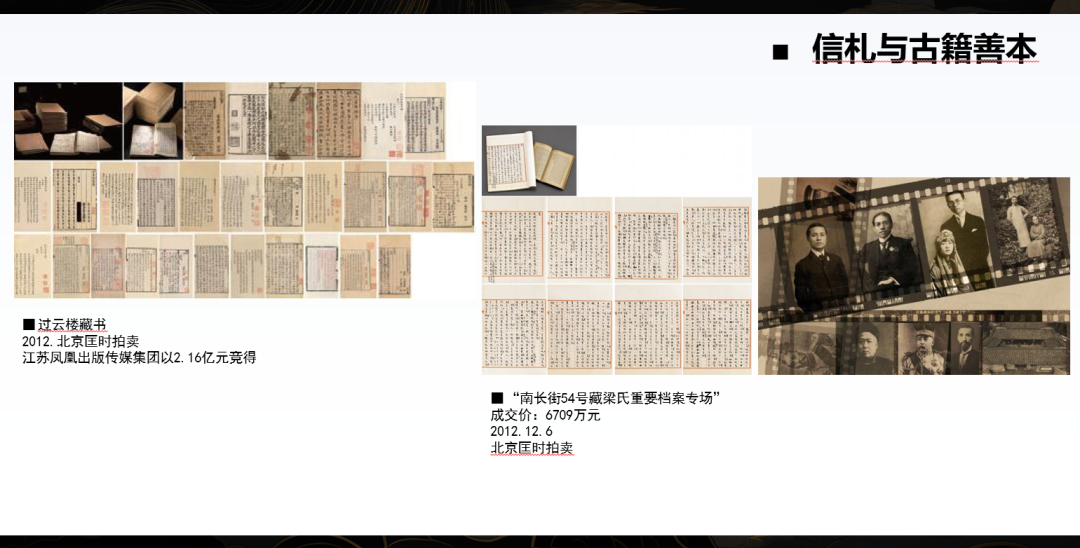 左边的过云楼藏书拍卖,是我经手的一个中国古籍拍卖的经典案例。整套古籍有130多部,原属于清代江南著名藏书世家“过云楼”的收藏。其中最重要的一部是宋代的《锦绣万花谷》,这部善本共40册,品相极其精美。当年,这场拍卖也创下了全球古籍拍卖的最高纪录,最后的成交过程也颇具戏剧性,有亲历者把它写成了一本书——《过云楼争夺战》。大家感兴趣的可以看看。