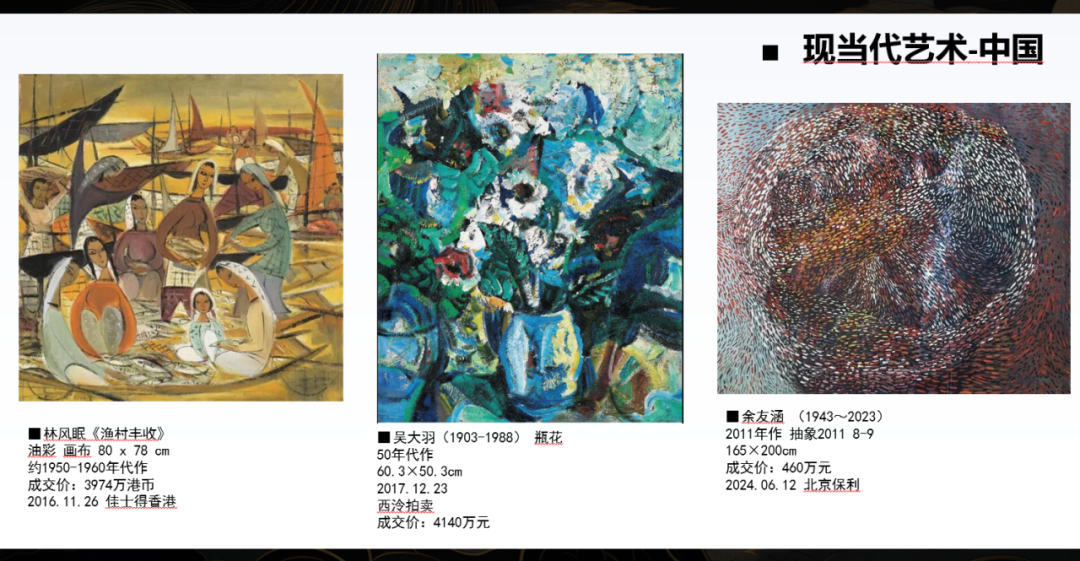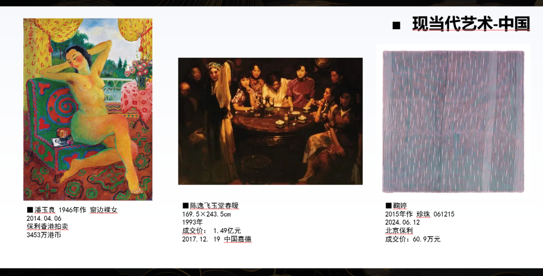左边这幅作品是20世纪中国留法女艺术家潘玉良的作品;中间是陈逸飞目前的最高成交纪录作品《玉堂春》,价格达到了1.49亿元。