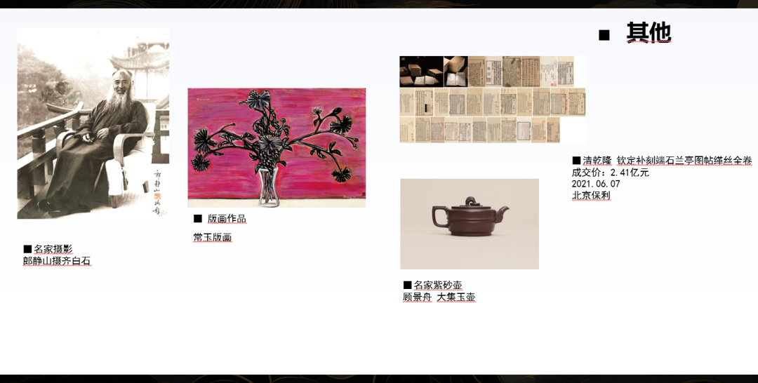 在经典的板块里,比如书画、瓷器、玉器、家具、珠宝等,挑选经典的作品。