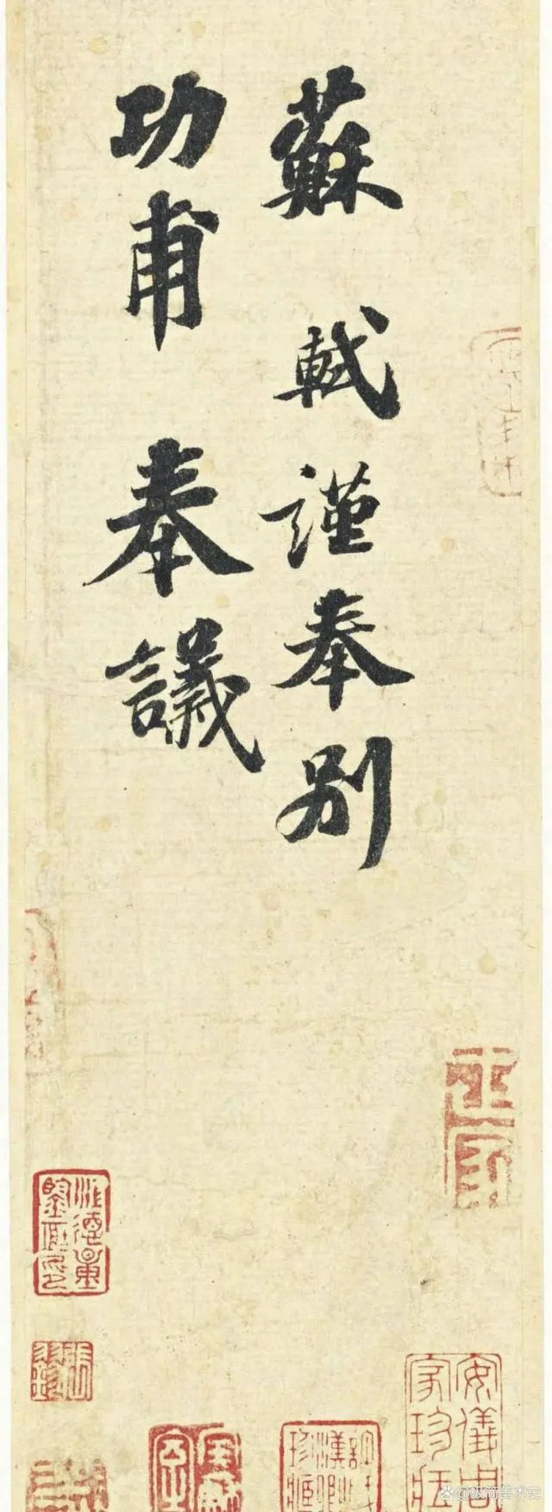 左侧这件藏品,现由上海龙美术馆创始人、投资界知名人士刘益谦先生收藏。这是苏东坡的便笺手迹,尺寸参考大家手中的手机——大约四部手机平铺起来的大小。这件苏东坡的便笺《功甫帖》,全篇只有9个字,2013年,作品以5037万元人民币的价格成交。