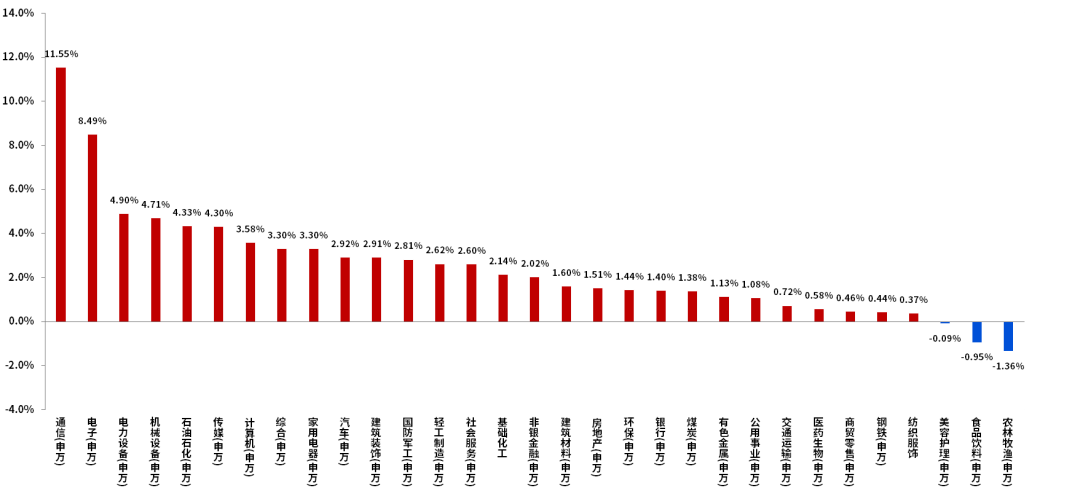上周上证综指涨2.88%,深证成指涨4.73%,创业板指涨8.05%,科创50涨7.27%。上周申万31个行业中28个行业收涨。涨幅居前行业有通信、电子、电力设备等;涨幅靠后行业有农林牧渔、食品饮料、美容护理等。
