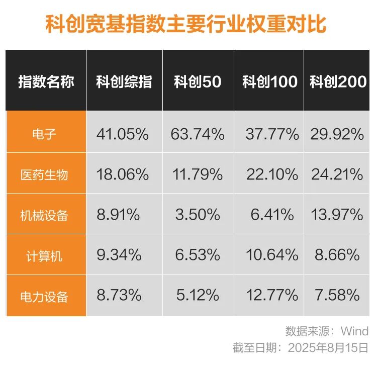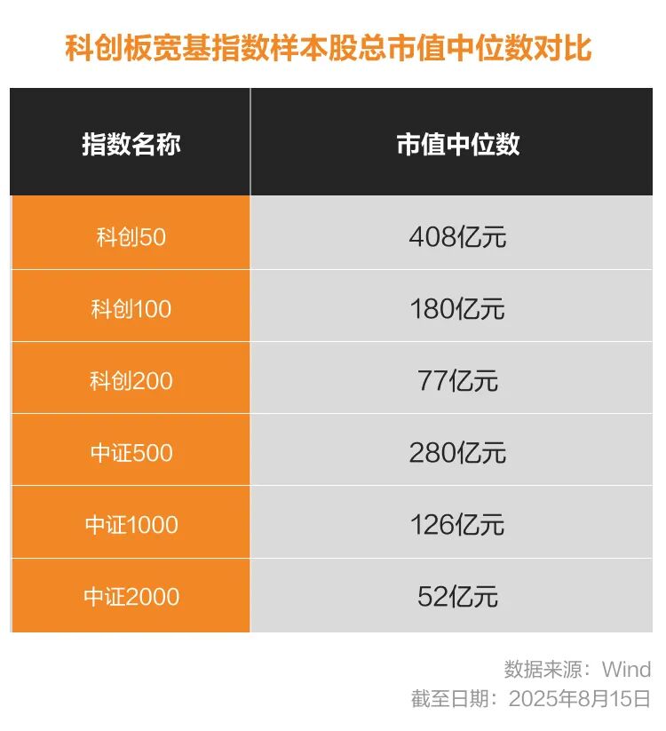 谈及规模指数,投资者比较熟悉的是沪深300+中证500+中证1000+中证2000这样的规模体系。简单理解,可以将沪深300视为是A股流通市值最大的300个股票,中证500是接下来500个,至于中证1000和中证2000则是以此类推。 而科创板,目前则是科创50、科创100、科创200、科创综指的规模体系,科创50代表科创板市值规模最大(由指数定期审核时点前的过去一年日均总市值确定)的50个个股,科创100是随后100个,科创200则是151至350名的个股,科创综指则包含了所有科创板个股的指数。根据Wind数据显示,截至2025年8月15日,科创综指的成分股数量是569个。 由于不同行业,大中小盘股的分布不均,所以不同的规模指数,往往会呈现一定的“行业偏性”,科创板的规模指数尤其如此。 我们在下表中将科创板宽基指数权重大于5%的行业分布对比,科创50超过60%权重在电子行业,而科创100和科创200类似,虽然电子行业是第一大行业,但医药生物权重占比也超过20%,此外科创200在机械设备上权重也比较高。 我们在下表中对科创板宽基指数样本股的总市值中位数进行对比,从样本股总市值中位数对比看,科创50的样本股总市值中位数超过中证500的样本股总市值中位数。科创200的样本股总市值中位数“介于”中证1000与中证2000之间。在一定程度上,可以作为区分科创板宽基指数的市值风格的参考。
