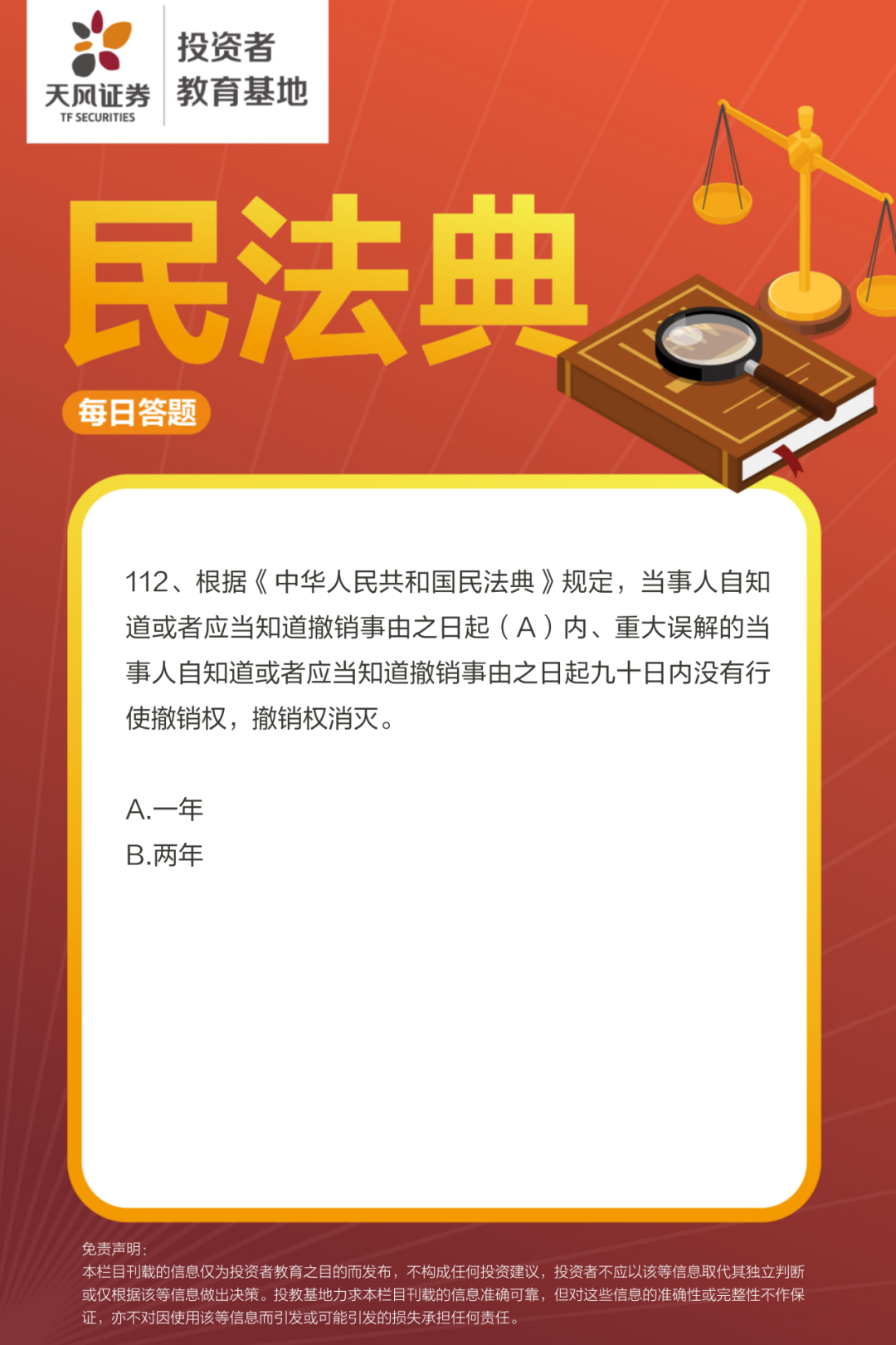 为全面贯彻落实党的二十大和二十届二中全会精神,深入学习宣传贯彻习近平法治思想,引导投资者深入学习民法典,重点宣传平等、自愿、公平、诚信等基本原则,促进经济高质量发展营造良好法治环境,天风证券投教基地特别开展民法典每日答题互动活动,欢迎广大投资者参与。点击图片,查看答案↓点击图片,查看答案↓点击图片,查看答案↓点击图片,查看答案