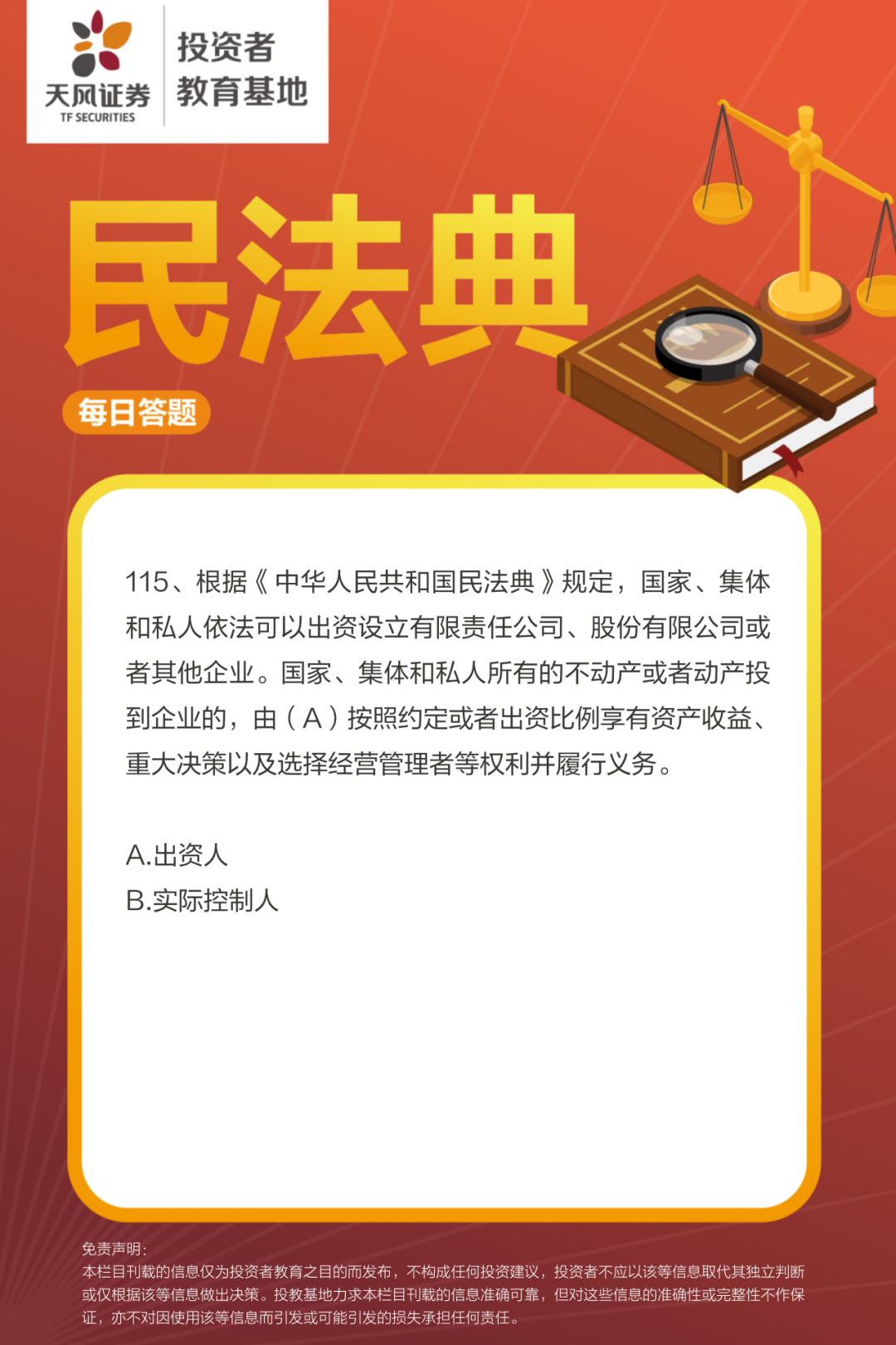 为全面贯彻落实党的二十大和二十届二中全会精神,深入学习宣传贯彻习近平法治思想,引导投资者深入学习民法典,重点宣传平等、自愿、公平、诚信等基本原则,促进经济高质量发展营造良好法治环境,天风证券投教基地特别开展民法典每日答题互动活动,欢迎广大投资者参与。点击图片,查看答案↓点击图片,查看答案↓点击图片,查看答案↓点击图片,查看答案