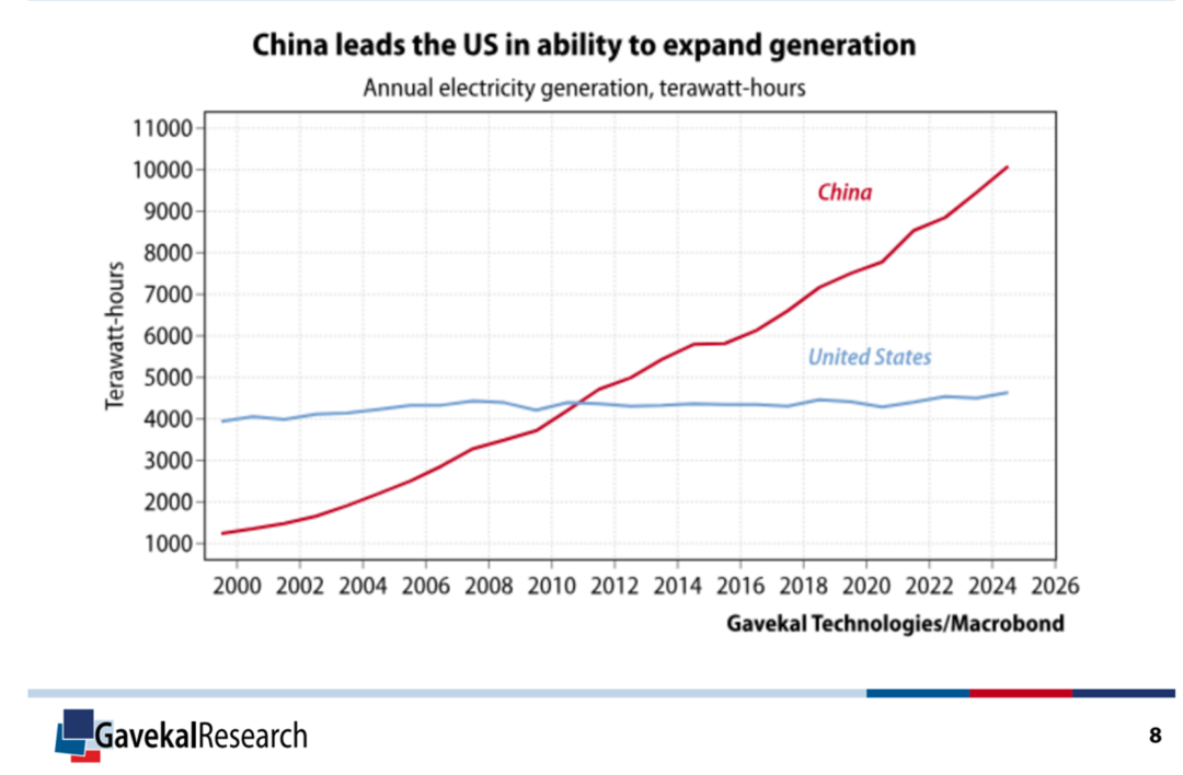 如果你认为,AI的瓶颈是高端算力,那当然应该不停买入英伟达。但这可能不完全对。但如果把整个生态链摊开来看,真正可能卡住AI 的,不是算力,而是电力。因为AI基础设施对于电力的需求是极高的,而这恰恰是美国感到越来越吃力的地方。