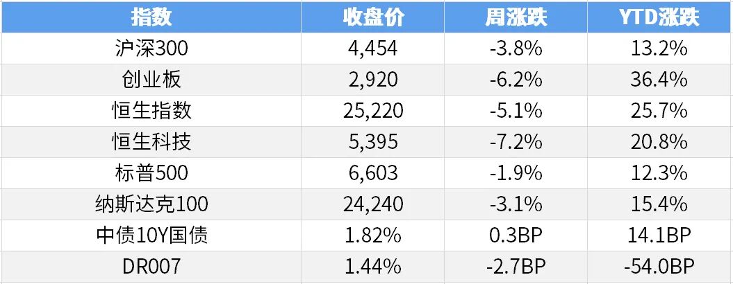 六、股票投资策略 1 股票市场周度回顾 A股市场整体表现:本周持续回落,各项风格全面调整。上证综指-3.90%,沪深300指数为-3.77%,深证成指为-5.13%,创业板指为-6.15%,中证1000为-5.80%,国证2000为-6.24%。 行业表现:行业全面回调,仅银行和消费白马调整较小,银行-0.89%、传媒-1.25%、食品饮料-1.44%、国防军工-1.72%、家用电器-2.30%;新能源和可选消费调整较为明显,电力设备-10.54%、基础化工-7.47%、商贸零售-7.24%、钢铁-6.98%、医药生物-6.88%。 港股市场整体表现:港股亦大幅调整,恒生指数为-5.09%、恒生科技为-7.18%。 行业表现:行业全面调整,红利板块相对稳健,电讯业-1.58%、公用事业-2.18%;内需相关调整较多,原材料业-8.65%、医疗保健业-7.40%、工业-6.77%、资讯科技业-6.27%。 2 投研随笔 此前市场再次冲击4000点时,我们明确提示三大风险:AI泡沫的分歧、美联储暂停加息、中美博弈的反复。目前来看,市场正在强化这些风险点。首先,AI泡沫的讨论仍在延续,对于AI终局的担忧继续发酵。虽然英伟达的业绩全面超预期,但其业绩主要是AI大厂竞赛式投资的结果,而AI大厂通过发债形式进行资本开支扩张,一定程度上已经隐含了泡沫。从近期美股表现看,市场并未对英伟达的超预期业绩指引买单,反而对于应用端的谷歌更为看好;尤其是从日本看,虽然中日关系趋于紧张,但市场的演绎仍以爱德万、东京电子的调整为主,中日相关的个股表现并不明显。其次,美联储因为就业数据的分歧导致市场降低降息预期,甚至美联储官员表示:再次呼吁在继续降息方面放慢脚步。一定程度上压制了市场的风险偏好,尤其是当前科技板块的估值明显偏高的环境,屋漏偏逢连夜雨。此外,最新资讯表示,为应对法院裁决,特朗普政府准备关税备用方案。原本些许缓和的中美关系或再生不确定性。除了外生因素以外,A股市场短期也面临着一些问题。一方面,临近年末不少资金存在结算和调仓需求,因此对于明显高估值的科技板块进行止盈;从常规的季节性考虑,岁末年初也往往面临风格切换等问题。另一方面,近期经济数据扰动,尤其是房地产数据的进一步下滑、M1与M2剪刀差的回落,提高了大家对于经济基本面的担忧。但从长期来看,十五五规划对于经济增长的需求、地产对经济拉动下降导致产业的切换的必然性等问题,未来科技仍是发展的重中之重。短期的调整更多是对于止盈的需求,而逐步进入到对于明年的布局阶段,科技的调整反而是一个不错的配置机会。 港股连续调整一个月,且最近因为美股的剧烈调整加剧港股的回落。同A股相同,核心的根源主要来源于两点,一是AI泡沫,未来AI的资本开支是否能够持续,应用端的规模化商业模式是否能够出现;恒生科技中互联网公司的权重较高,对于应用端的侧重明显高于A股。二是美联储降息节奏的放缓,美元指数自10月初以来持续走强,一定程度上压制港股的弹性。后续来看,需着重观察美国科技股和美元指数的变化。从长期配置角度看,本轮的调整或再次迎来“黄金坑”,但需要考虑本轮调整的幅度和深度。