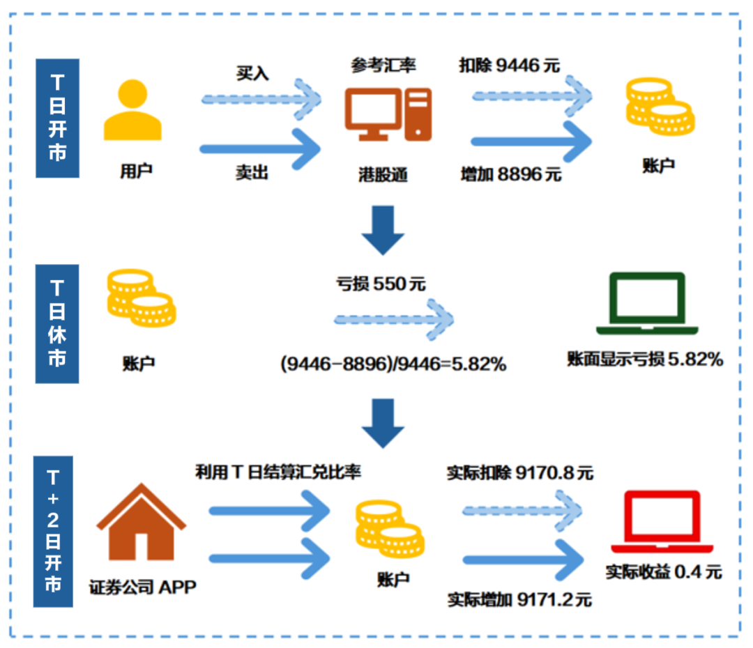 如果投资者在T日以相同价格先买入、后卖出同一只港股通股票,T日交易软件账面显示“亏损”6%左右,这并不代表真实的投资亏损,而是港股通独特的汇率结算机制导致的,实际需以T+2日资金交收为主。