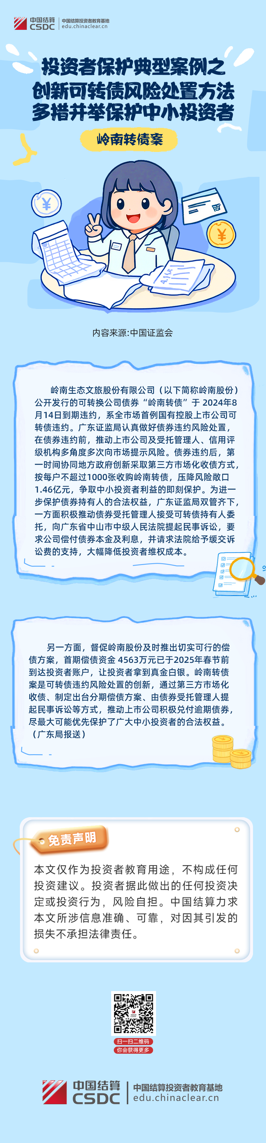 中国结算投教 | 投资者保护典型案例之创新可转债风险处置方法 多措并举保护中小投资者 岭南转债案