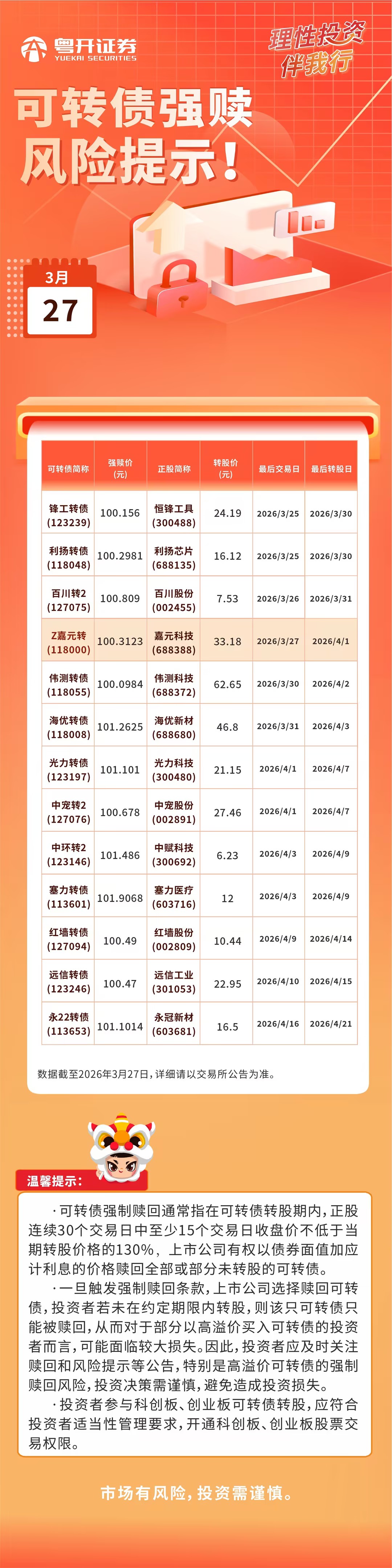 2026.3.27可转债强赎风险提示