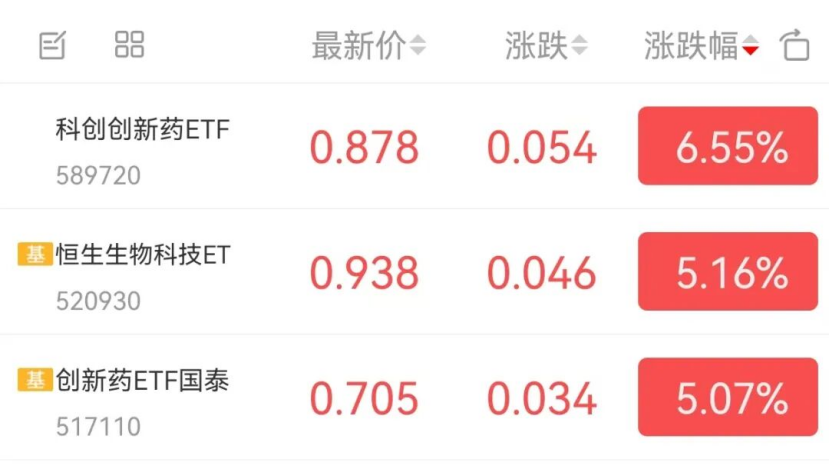 今日,科创创新药ETF(589720)收涨6.55%,创新药ETF(517110)收涨5.07%,恒生生物科技ETF(520930)收涨5.16%。