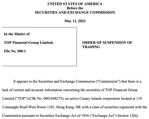 5月11日,美国证券交易委员会(SEC)紧急暂停了中阳金融集团(TOP)的美股交易,原因是,这家香港券商的股价出现了“无法解释的剧烈波动”。尽管次日上午,这只股票阴差阳错仍然出现了34万股的交易,但交易所及时宣布取消中阳金融在美东时间5月12日上午9:30至10:09之间的交易。