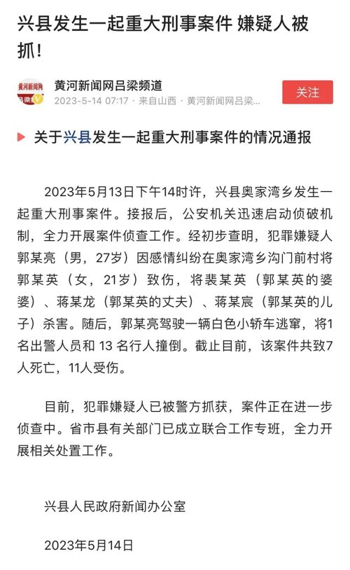 5月13日,山西吕梁兴县发生一起重大刑事案件,造成7人死亡、11人受伤。当地通报如下: