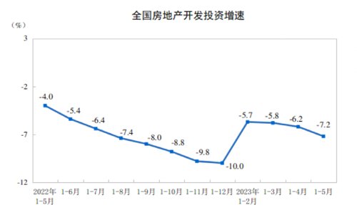 从房地产开发投资完成情况来看,1—5月份,全国房地产开发投资45701亿元,同比下降7.2%(按可比口径计算,详见附注6);其中,住宅投资34809亿元,下降6.4%。